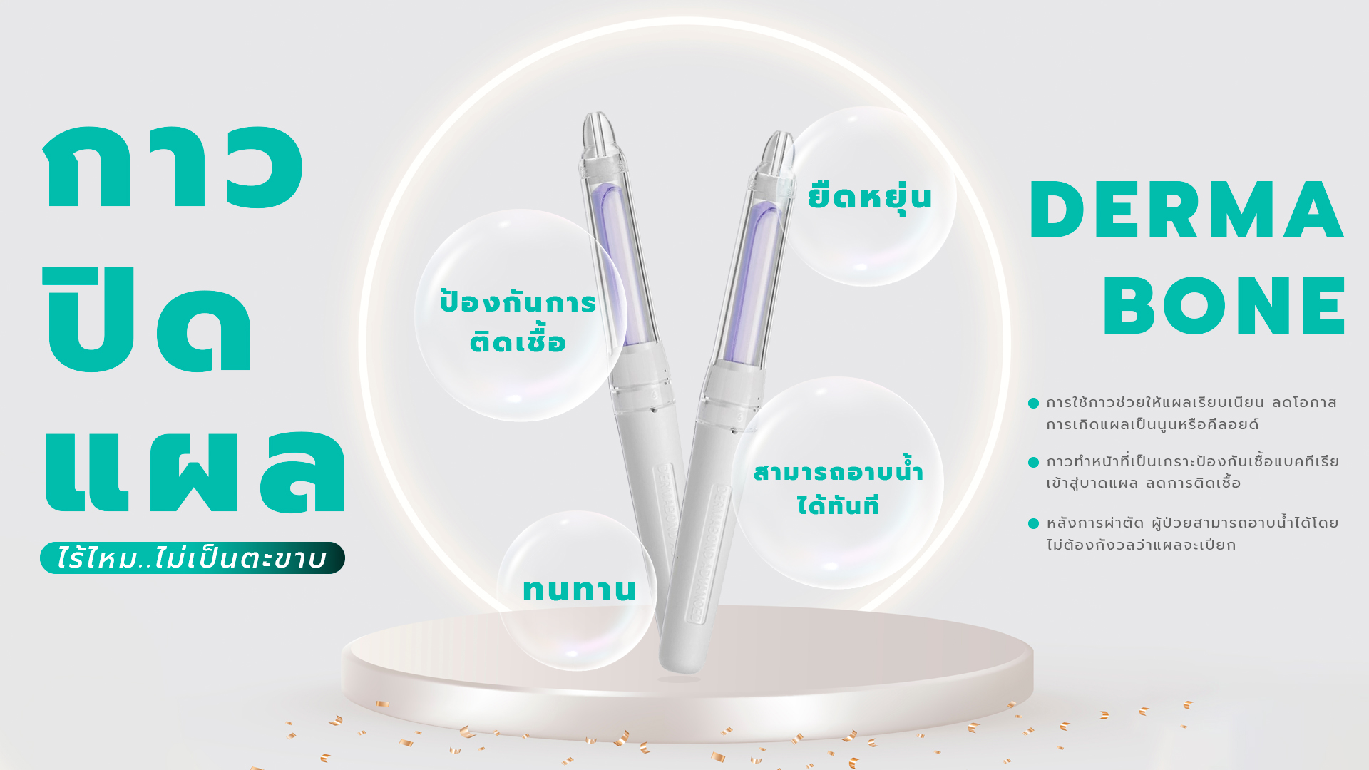 • ป้องกันการติดเชื้อ: กาวทำหน้าที่เป็นเกราะป้องกันเชื้อแบคทีเรียเข้าสู่บาดแผล ลดความเสี่ยงการติดเชื้อ
